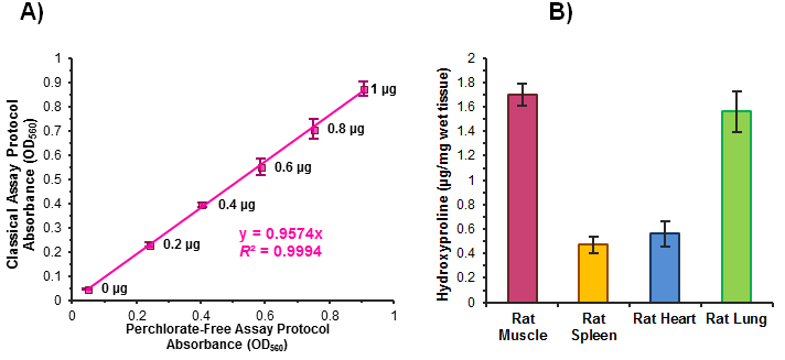 Figure (A). 經(jīng)典高氯酸法檢測的試劑盒(k555-100)和無高氯酸法檢測試劑盒(k266-100)的標(biāo)準(zhǔn)曲線之間的相關(guān)性比較。數(shù)據(jù)顯示此兩種檢測方法具有非常好的相關(guān)性(R2 > 0.999)。 (B). K266-100試劑盒檢測大鼠樣本中的總羥脯氨酸的含量。