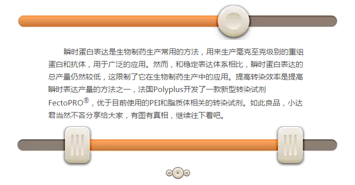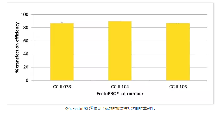 高質(zhì)量質(zhì)粒DNA的制備成本非常高,尤其是在進(jìn)行大規(guī)模蛋白質(zhì)生產(chǎn)時(shí)需要大量的DNA和許多質(zhì)粒。FectoPRO?通過使用0.4~0.6 μg/106/ml的細(xì)胞培養(yǎng)液將DNA成本縮減了40%~60%,使其成為生物制藥生產(chǎn)流程的一項(xiàng)經(jīng)濟(jì)實(shí)惠的選擇。