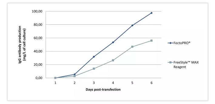 圖1. FectoPRO?大幅提高懸浮CHO細(xì)胞的抗體產(chǎn)量。按1×106個(gè)細(xì)胞/ml的密度將細(xì)胞培育在30ml的無血清培養(yǎng)基中,并依照每種試劑說明書推薦用量FectoPRO?(0.8 μg DNA/ml)或FreeStyle?MAX試劑(1.25 μg DNA/ml)進(jìn)行轉(zhuǎn)染。用蛋白質(zhì)G生物感應(yīng)器(fortéBIO? octet RED96 system)對(duì)重組小鼠IgG的產(chǎn)量監(jiān)測1~6天?!狿roteoGenix SAS(法國)提供的數(shù)據(jù)。