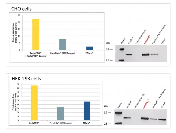 圖2. FectoPRO?大幅提高懸浮CHO和HEK-293細(xì)胞的蛋白產(chǎn)量。按1×106個(gè)細(xì)胞/ml的密度將FreeStyle? CHO-S和HEK-293F細(xì)胞培育在30 ml的無血清培養(yǎng)基中,并依照每種試劑說明書推薦用量FectoPRO?+FectoPRO?輔助藥劑Booster (0.4 μg DNA/ml)、FreeStyle?MAX試劑(1.25 μg DNA/ml)或PEIpro?(1 μg DNA/ml)進(jìn)行轉(zhuǎn)染。用蛋白質(zhì)G親和性定量法(HPLC)和Western Blot檢測轉(zhuǎn)染后72小時(shí)(CHO細(xì)胞)和120小時(shí)(HEK-293細(xì)胞)的IgG3-Fc (34 kDa)的產(chǎn)量。