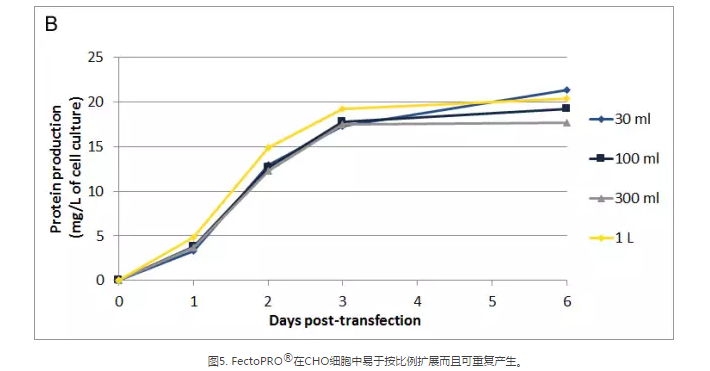 FectoPRO?介導(dǎo)的轉(zhuǎn)染無需改變流程便可將細(xì)胞培養(yǎng)基按比例從30ml擴(kuò)展至數(shù)升。