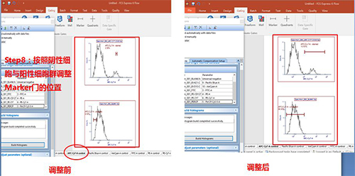 圈好門之后,選中單管Control版面,按照陰性細胞與陽性細胞的位置調(diào)整Marker門的位置。