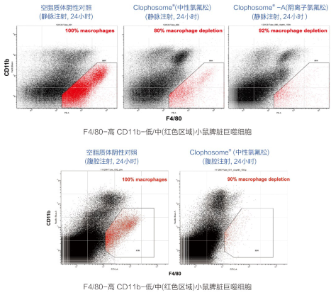 并且,在單次靜脈注射或腹腔注射0.2 ml Clophosome?(中性氯弗松)后自24小時起脾臟和肝臟中巨噬細胞耗竭可持續(xù)一周保持在80%以上,如果每4天注射一次,高效巨噬細胞耗竭可維持數(shù)周之久。此外,Clophosome?-A(陰離子氯弗松),除保持了Clophosome?(中性氯弗松)所有優(yōu)點之外,更使得單次注射后巨噬細胞的耗竭率高達90%以上。