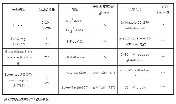 首先,需考慮選擇合適的親和標簽。常用于哺乳動物表達系統(tǒng)的親和標簽有His-tag、FLAG-tag、GST-tag及Strep-tag?等[4-12],整理于下表: