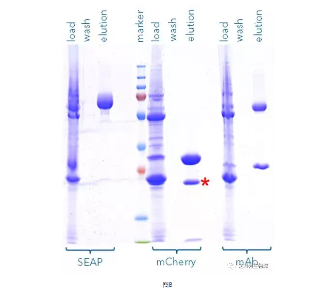 此外,我們也測試了其他的蛋白,例如SEAP(72 kDa)或抗體(mAb,其重鏈為55kDa)。圖B為以Strep-Tactin?XT純化SEAP-TST、mCherry-TST與mAb-TST的SDS-PAGE分析結果,可見對于不同蛋白,Strep-tag?系統(tǒng)都能純化出高純度的目標蛋白。(注:紅色標記處為 mCherry的降解產物,非雜帶)