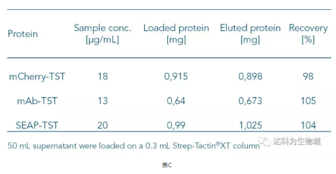 因Strep-Tactin?XT與Twin-Strep-tag蛋白的高親和力,即使目標蛋白的濃度低,使用Strep-Tactin?XT仍可以有效的捕捉上清中的目標蛋白。表C整理了幾個實驗的數據,顯示當目標蛋白濃度低于20μg/ml時,得率仍能達到幾近100%。
