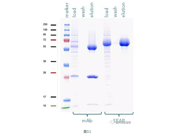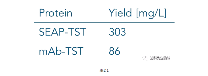 除了上述實驗所用的CHO細胞株外(中國倉鼠卵巢細胞),另一常用于生產蛋白的哺乳動物細胞株為HEK293(人胚胎腎細胞),使用上較CHO簡單。我們測試了Strep-Tactin?XT的純化表現:表D1為以Expi293表達SEAP-TST或mAb-TST蛋白后,目標蛋白的濃度。圖D2為純化表現的SDS-PAGE分析。從中可知,與ExpiCHO培養(yǎng)基相同,直接將表達好的Expi293上清加入1ml Strep-Tactin?XT高載量重力柱中進行純化,一樣能夠快速的得到高純度的目標蛋白。