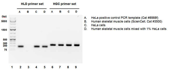 HeLa基因組DNAgDNA)檢測(cè)引物組分(HLD識(shí)別并擴(kuò)增基因組中不存在于其他人類細(xì)胞的HeLa細(xì)胞特異性序列。