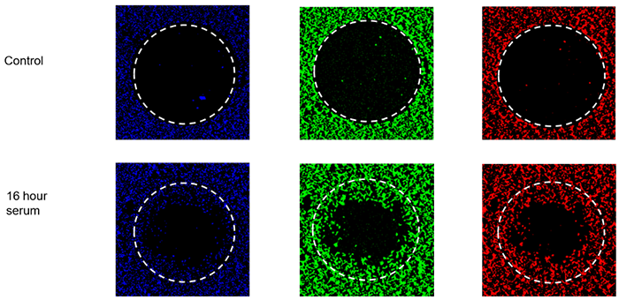 細(xì)胞排斥區(qū)分析(間隙封閉法)是Platypus公司獲得專利的技術(shù)。讓細(xì)胞在孔的底部圍繞一個阻止細(xì)胞生長的區(qū)域(如在孔底部中央放置阻塞物)生長,實(shí)驗(yàn)在移除阻塞物后開始,可觀察單層細(xì)胞遷移到原先的空白區(qū)域中。