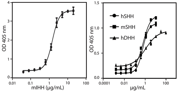 C3H10T1/2干細(xì)胞培養(yǎng)至細(xì)胞融合,使用BMP-9(20 ng/mL, Cat. No. 553102)和不同濃度的h/mSHH、或hDHH、或mIHH(Cat. No. 753502, 754602, 759802,758602)處理,將間充質(zhì)干細(xì)胞誘導(dǎo)分化為成骨細(xì)胞。使用對硝基苯磷酸酯作為底物,檢測成骨細(xì)胞標(biāo)記物堿性磷酸酶。