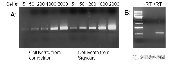 圖2 A: 比較Signosis與其他品牌的細胞裂解液。分別對裂解產(chǎn)物中的β-actin進行30個循環(huán)反轉(zhuǎn)錄PCR。