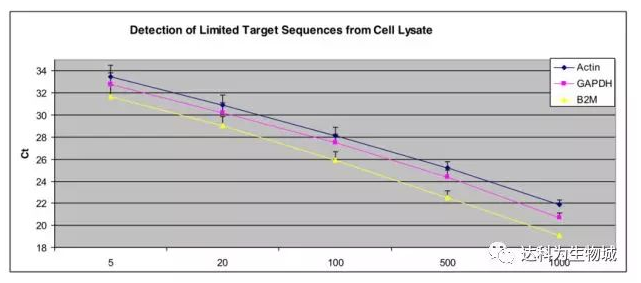 隨著HeLa細胞數(shù)的增加,分別用適量細胞裂解液裂解細胞后進行反轉(zhuǎn)錄,而后在7700 PCR儀上進行Actin、GAPDH和B2M基因的3復(fù)孔qPCR反應(yīng)。