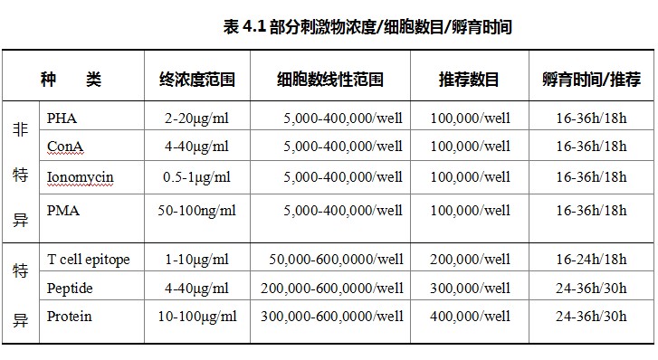 不論是普通多肽(比如重疊多肽庫(kù))還是蛋白質(zhì)或者蛋白類的組織提取物,這些刺激物都需要APC的攝取、內(nèi)化、加工、呈遞,之后T細(xì)胞才能被刺激。所以,使用這些刺激物的時(shí)候,一定要保證足夠的細(xì)胞密度。根據(jù)我們的經(jīng)驗(yàn),細(xì)胞密度要至少達(dá)到20萬-30萬每孔。多肽推薦的細(xì)胞密度為30萬/孔,蛋白推薦的細(xì)胞密度為40萬/孔。也可以根據(jù)實(shí)際情況,在線性范圍內(nèi)調(diào)整,參見表4.1與圖4.2。