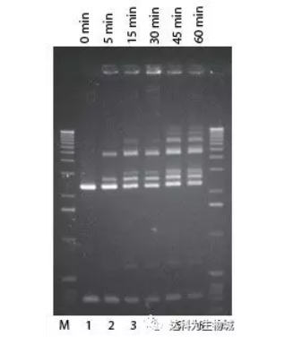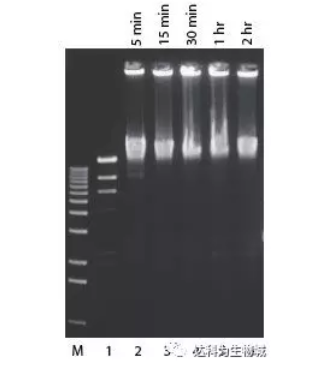 pUC 19 DNA用Pvu II消化,然后按標(biāo)準(zhǔn)連接反應(yīng)使用2U Fast-Link? ligase進(jìn)行連接(泳道1-6). 泳道 M,1-kb ladder;泳道1,無(wú)酶對(duì)照;泳道2-6, 分別為5 min, 15 min, 30 min, 45min, 1 hr連接結(jié)果。