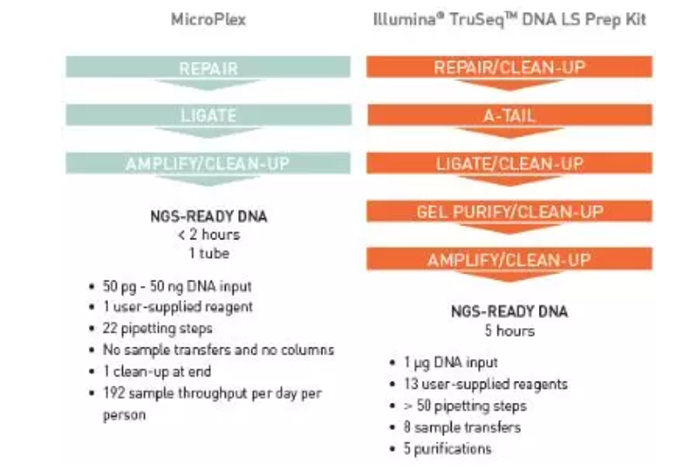MicroPlex ki只需要一次純化,三步即可完成。而Illumina?的工作流程需要純化多次,經(jīng)過(guò)5步才能完成。