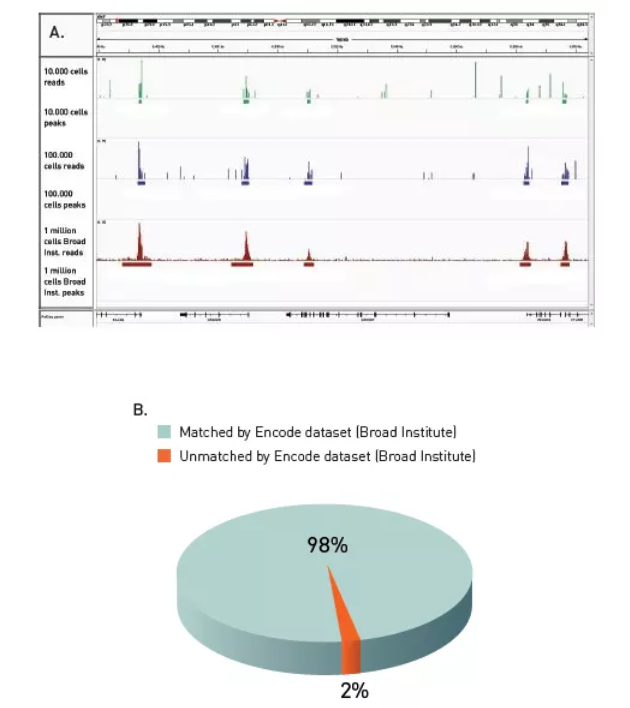 Fig.3 對(duì)ChIP-seq富集產(chǎn)物的可靠檢測(cè),并與ChIP-seq參考數(shù)據(jù)完美匹配。