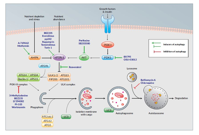 自噬是原生分解程序,由細(xì)胞內(nèi)應(yīng)激物(營養(yǎng)物和能量貧乏)引起。自噬由生成自噬體開始,這一步驟由一系列蛋白調(diào)控,包括VPS34的Ⅲ型磷脂?;迹?/span>PI)3激酶復(fù)合體,隨后與溶酶體的融合將自噬體酸化。自噬的阻斷有多種形式,例如Ⅲ型PI3激酶抑制劑可通過抑制自噬捕獲動作而阻斷自噬進(jìn)程,或者用抑制溶酶體酸化的抑制劑阻止自噬溶酶體的形成和自噬降解。自噬進(jìn)程是被縝密調(diào)控的。mTORC1,一種對營養(yǎng)物和生長因子敏感的激酶,是自噬的主要阻遏器。因此,mTORC1及其信號通路的抑制劑可誘導(dǎo)產(chǎn)生自噬。