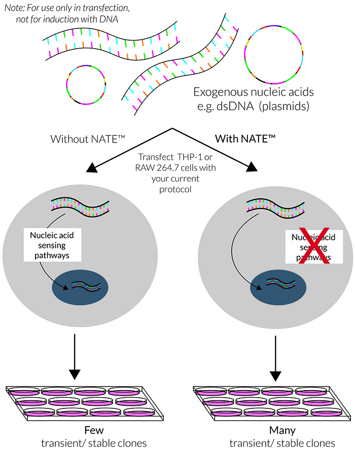 在真核細胞轉染期間,外源核酸(如質粒DNA)的主要障礙是它們會被胞質傳感器檢測,如cGAS/STING,AIM2炎癥小體和LC3介導的自噬。這些防御性級聯(lián)信號的激活通常會導致低轉染效率、降低的細胞活力和不一致的結果,尤其是在難轉細胞(如免疫細胞)的轉染實驗中。NATE?抑制許多核酸感應途徑,從而保護外源DNA并促進其表達。