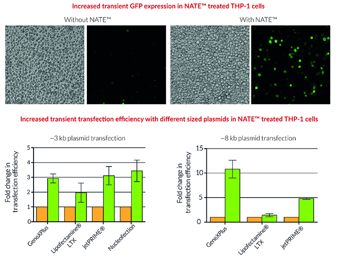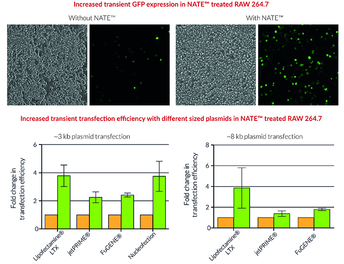 NATE?是由InvivoGen專門推出的核酸轉染增強劑,用于提高免疫細胞的瞬時和穩(wěn)定轉染效率,尤其適合THP-1和RAW 264.7細胞,只需在轉染步驟前添加NATE?孵育30分鐘,即可進行后續(xù)轉染操作。